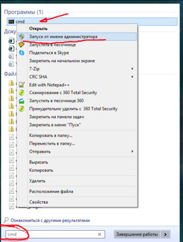 - 1. Открываем командную строку от имени Администратора (Для этого заходим в поиск и вводим cmd, далее жмем на появившееся в поиске черное окно правой кнопкой мыши и выбираем «Запуск от имени Администратора«.)